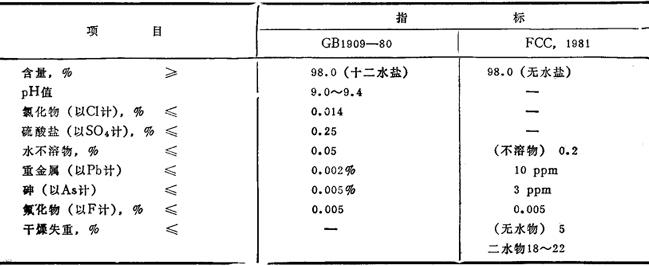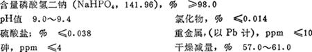 | 释义 | 磷酸氢二钠 别名 磷酸二钠 分子式 Na2HPO4·0~12H2O 分子量141.96~358.14 性能 分无水与结晶品两种。结晶品含十二个结晶水。无色至白色斜方晶系或单斜晶系结晶。相对密度1.52。加热至34~35℃时溶解于结晶水中,常温时放置于空气中失去约5mol(25%结晶水)。加热至240℃以上,成为焦磷酸钠。与空气中二氧化碳反应生成磷酸二氢钠和碳酸氢钠。易溶于水(12g/100mL,25℃),3.5%水溶液的pH值9.0~9.4。 无水品为白色粉末,具吸湿性,放于空气中可逐渐成为七水盐。溶于水(9.3g/100mL,20℃),呈碱性。不溶于乙醇。加热至200℃以上成焦磷酸钠。毒性: ADⅠ0~70mg/kg,(以总磷计:FAO/WHO1985); MLD>985≤1075mg/kg(兔,静脉注射); GRAS(FDA,§182,6290,1985)。 质量规格(GB1909-80;FCC,1981;JSCⅠ-Ⅱ)