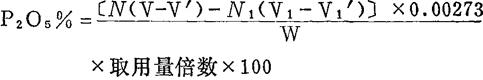 式中:N——氢氧化钠标准液的当量浓度; N1——盐酸标准液的当量浓度; V——加入氢氧化钠标准液的总体积(ml); V′——空白试验加入氢氧化钠标准液的体积(ml); V1——滴定用去盐酸标准溶液的体积(ml); V1′——空白滴定用去盐酸标准液的体积(ml); 0.00273——每毫克当量氢氧化钠相当于P2O5克数。 此因素由下列反应式推算而得: (C9H7N)3·H3PO4·12MoO3+26NaOH= Na2HPO4+12Na2MoO4+3C9H7N+14H2O 根据反应式可表明52个克分子即可相当1个P2O5,因此每毫克当量NaOH相当的P2O5的克数为 |