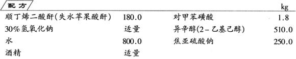 (1)酯化 在搪瓷反应锅中加入异辛醇、失水苹果酸酐及对甲苯磺酸,加热升温到60℃使物料熔融,搅拌,在1~2h内升温到140℃,保温至水全部脱尽为止。抽样化验,到酯化率大于93%时,冷却到80℃,在搅拌中逐渐加入液碱,中和到pH值7~8。