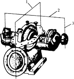 图8-59 水泵找正方法 1.纵中心线 2.横中心线 3.垂线 (2)找水平:找水平的目的是使水泵轴要呈水平状态,水泵的进、出口法兰盘面呈垂直状态,保证与进、出水管的连接正确。水泵找平常用以下几种方法: ①小型离心泵找平时,将水平尺靠在水泵进、出口的法兰盘面上和轴端靠背轮的端面上,用楔形铁块调整水泵的高低,使水平尺的气泡居中。 ②大中型Sh型水泵,可揭开泵盖,在泵座与泵盖接合面上选4个“+”字形的点,立水准尺,用水准仪观测四点水准尺的读数。如4个点水准尺读数相等,表明水泵呈水平。如有误差且4个方向误差值超过0.3~0.5mm/m,表明水平超过规定值,应用楔形铁块调整直到达到要求为止。 (3)测标高:水泵标高是指水泵轴中心线的高程。测标高的目的是检验水泵实际安装高度和设计安装高程是否符合,以保证水泵在允许的吸水高度内工作。测标高的方法是,利用两个标杆,一个放在预定的基面上,另一个放在泵轴中心线的基面上,用水准仪标定,经计算后找出实际安装高程。 3.动力机的安装 安装动力机时因传动方式不同,对安装的要求也不一样。 直接传动多用于电动机。安装电动机时要求电动机轴与水泵轴在一条直线上,即有同心度要求。电动机安装的关键在于对准已安装好的水泵轴中心线,也就是把水泵和电动机的两个联轴器调整到平行、对中,间距适宜。 水泵和电动机的联轴器之间留有一定的间隙,称为轴向间隙,是用来防止水泵轴或电机轴有轴向窜动时,两联轴器可能发生的碰撞现象。按规定要求可参考表8-59调整。 表8-59 联轴器轴向间隙要求(单位:mm)