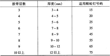胶带螺钉连接是把平型带两头搭在一起,用专用蟹壳螺钉紧固,一般只用4只,蟹壳螺钉的选用可参考表8-61。安装时要注意螺钉不要露出太长;胶带搭接应顺着胶带轮的转动方向,以免接口直接撞击胶带轮,发生危险。 表8-61 蟹壳螺钉的选择
