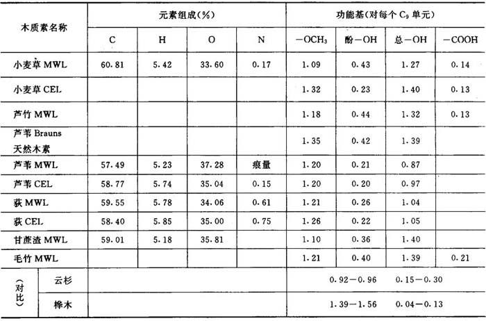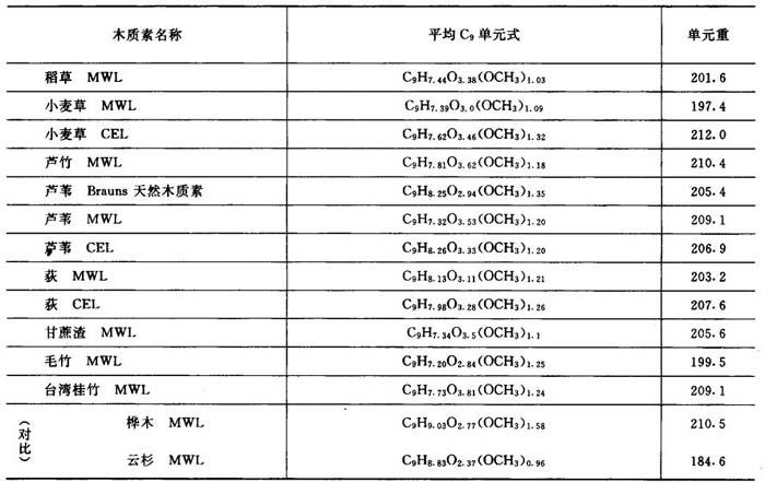 注:MWL——磨木木质素;CEL——酶分离木质素。 2.木质素的功能基 木质素分子中存在多种功能基,如甲氧基(-OCH3)、羟基(-OH)、羰基(-CO)等。木质素功能基的种类和数量在很大程度上影响木质素的反应性和溶解性。 木质素中的甲氧基是联接在苯环上的,一般比较稳定,但在高温作用下,例如在氢氧化钠或硫酸盐法蒸煮时,木质素甲氧基中甲基将裂开而形成甲醇。木质素中甲氧基含量的多少与木质素结构中苯基丙烷单元类型有关。一般针叶木木质素中甲氧基含量为13.6~16%,阔叶木木质素为17~22.2%。阔叶木的甲氧基含量比针叶木高,这是因为阔叶木的木质素除愈创木基外,尚含有较多的紫丁香基的缘故。 表2-9-1中还列出常用禾本科植物原料木质素中功能基的含量。可以得出禾本科木质素有如下特点: ①禾本科木质素中的甲氧基含量介于针、阔叶木之间。禾本科木质素的OCH3/C9值为1~1.3,而针叶木木质素OCH3/C9大多在0.87~1.0,阔叶木为1.21~1.59。其中,稻、麦草、蔗渣木质素较接近于针叶木,而竹、苇、荻等木质素中甲氧基含量与阔叶木相近。 ②禾本科木质素的酚羟其含量比木材高。禾本科的酚羟基一般为0.4~0.45/C9,而木材木质素仅为0.1~0.3/C9。禾本科木质素中还含有0.1~0.2/C9的羧基。禾草木质素中含有较多量的酸性基团(包括酚羟基和羧基),是其比木材木质素在碱中易溶的主要原因之一。 3.平均C9单元式 根据木质素的元素分析和甲氧基的含量,可计算出各种木质素的平均C9单元经验式,如表2-9-2所示。 表2-9-2 木质素的平均C9单元式