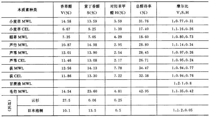 注:MWL——磨木木质素;CEL——酶分离木质素。 由于测定者所用原料产地不同,采用的木质素分离方法不同,以及研究方法和仪器不同,因此对同一种原料的分析结果也不完全相同。 4.木质素的结构单元 木质素的碱性硝基苯氧化产物揭示了木质素中未缩聚的结构单元的比例,也在一定程度上反映了木质素的缩聚程度。 表2-9-3列出一些非木材植物原料木质素碱性硝基苯氧化产物的分析结果,可得出木质素中三种基本结构单元的比例。 表2-9-3 木质素碱性硝基苯氧化产物