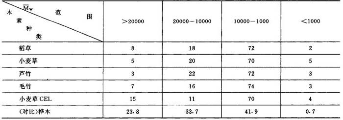 注:MWL——磨木木质素;CEL——酶分离木质素 禾本科中的酚酸结构除对—香豆酸外,还有阿魏酸。阿魏酸主要以醚键与其它木质素结构单元连接,主要形成α-醚键。这种醚键的键能很低,在缓和条件下也可能断裂。 6.木质素的分子量及分子量分布 禾本科木质素的平均分子量及其分布情况列于表2-9-5和表2-9-6中。草类木质素的分子量低,多分散性大,是草类木质素不同于木材的特点。稻麦草、芦竹、毛竹、蔗渣、荻、苇等磨木木质素的重均分子量Mw在7500~12000间,数均分子量Mn在3000~4500,比木材木质素的分子量要小得多。在同样条件下测得的桦木木质素的分子量几乎为禾本科木质素的一倍。而且桦木木质素分子量在1000~10000级分的木质素很少,大大低于禾草木质素。禾本科木质素分子量低,是它在制浆中易溶出的重要原因。 表2-9-5 磨木木质素的分子量与多分散性