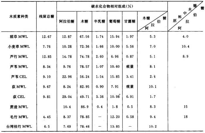 注:CEL——酶分离木质素。 同一种原料,木质素的分离方法不同,测定的分子量大小也有差别,纤维素酶分离木质素的分子量比磨木木质素平均分子量高。 7.分离木质素中糖的组成 木质素与碳水化合物之间有化学联结形成木质素——碳水化合物复合体(LCC)。在木质素分离和纯化以后的分离木质素制备物中,仍残留相当数量的糖。表2-9-7列出禾本科原料用不同分离方法得到的木质素制备物中含糖量及各单糖的组成。 表2-9-7 分离木质素中糖的组成