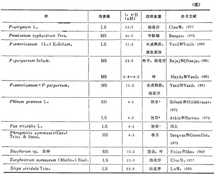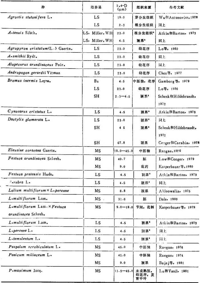 a.只有愈伤组织,未能再生植株。 愈伤组织生长和增殖所需2,4-D和其它营养浓度较低于诱导培养基。这样状态或用延长愈伤组织继代时间或用转移到2,4-D降低的1/2强度培养基中来达到。大多数饲草愈伤组织培养体生长和增殖加2,4-D4.5-9.0μM已能满足。 通常是无组织块的愈伤组织培养体,常分化成各种细胞类型,可能经克隆产生更多愈伤组织,或引发产生芽、根和体细胞胚(胚状体),终而生长成株。如果愈伤组织在产生芽原基前生根,就很不可能将再发育成芽原基。 日益增多论证指出,虽可用相同基础培养基诱导愈伤组织、增殖,器官建成和植株再生。但所需生长素与KIN和其它生长调节剂用量和比率不同,且为愈伤组织生长和分化不同时期的关键。例如,2,4-D对愈伤组织诱导和增殖虽有重要作用,但器官建成和形成再生植株并不需要。一般言之,相对高生长素和低浓度KIN(例如,用于黑麦草2,4-D6.8μM,IAA37.1μM和KIN10.2μM),促进着愈伤组织诱导和增殖。另一方面,高水平KIN(4.6μM)和低生长素(2,4-D2.3μM)用于Lolium spp.促进芽形成。为了体细胞胚胎发生,对生长素需要水平较低于芽器官建成。完全除去2,4-D,常导致已进行器官建成的愈伤组织培养体形成植株。 草类任何分生组织都有可能启动愈伤组织培养体,但并都有再生植株能力。一般来说,未成熟胚产生的愈伤组织培养体,植株再生率最高;降低2,4一D水平(2.3μM),降低培养基强度(1/2强度)和延长培养期间可促进分化和器官建成。附加其它生长调节剂如玉米素,也能促进草类的器官建成。 几种禾本科作物曾从愈伤组织培养体再生成功,例如甘蔗,水稻,小麦,T.durum L.,玉米,大麦,燕麦,高粱,Ponicum miliaceum L.(Rangan,1974),珍珠粟和小黑麦,以及几种饲草。 饲草再生首次成功的可能是一组热带草种。Urata和Long(1968)报道了Brachiaric ruziziensis Germain & Evrard,Digitaria decumhensStent,甘蔗,野生蔗等草类愈伤组织培养在含无机盐类,蔗糖,琼脂,CW和2,4-D培养基上。这种愈伤组织进行器官建成,长成芽原基,转到无2,4-D培养基后,产生完整植株。还说组织培养可用于繁殖不育杂种,用秋水仙素处理愈伤组织可诱导产生双倍数体。 Heinz和Mee(1969)用甘蔗、野生甘蔗和甘蔗属杂种茎尖、叶和花序建成愈伤组织培养体。这是在附加2,4-D13.6μM+CW10%(v/v)的MS诱导产生的。转到不加2,4-D培养基后,产生植株分化。有些再生植株是亲本克隆的形态变异体,由此建立着草类通过愈伤组织培养产生新基因型的可能性。 随着热带草类的成就,Gamborg等(1970)从全叶雀麦草的冷季草种悬浮培养体再生成功,但都是白化苗。这或者是首次饲草种悬浮培养体取得的体细胞胚胎发生。Schenk和Hildebrandt(1972)将未成熟种子培养在2,4-D2.3μM+p-氯苯氧乙酸10.7μM+KIN0.46μM启动愈伤组织培养体。培养加2,4-D4.5μM液体悬浮体中,28℃,暗培。用无2,4-D的B5培养基洗培养的细胞,旋转振荡150rpm,28℃,B5培养基。2周内,当转移到B5固化培养基上,培养在18/6h光/暗周期,15/18℃,这些悬浮培养体产生体细胞胚。30天内出现几打白化再生植株。 饲草再生的成就为其它饲草类创建着愈伤组织和细胞培养的趋向(表20-11)。1975年期间,四位学者同时报道禾本科愈伤组织再生植株:黑麦草,大麦,芦苇,和玉米。每个种愈伤组织诱导都发生于附加减量2,4一D或不加2,4-D培养基,从而得到植株再生。黑麦草愈伤组织是把未成熟胚接种在MS+2,4-D6.8μM+IAA37.1μM+KIN10.0μM诱导产生,用1/2MS+2,4-D3.4μM+IAA21.4μM+KIN5.0μM再生植株。加CW(1ml/l)促进愈伤组织培养体芽器官发生和产生叶绿素。大麦茎尖分生组织接种在MS+IAA10μM+2,4-D15μM+2ip1.5μM诱导愈伤组织,在同样培养基不加任何生长调节剂取得了再生植株。在含有IAA和2ip培养基中加NAA20μM促进愈伤组织增殖;但2ip对保持愈伤组织还不能肯定。 Sangwan和Golrenflot(1975)用四倍体(2n=4x=48)和八倍体(2n=8x=96)芦苇根茎接种在MS+2,4-D4.5μM。他们也采用2,4-D2.3-45.2μM,在2,4-D2.3-13.6μM培养基产生了愈伤组织。激动素不能加强愈伤组织形成,KIN4.6-9.3μM反有抑制。高水平KIN减少愈伤组织生产。在KIN0.46μM+CW5%(v/v)培养基上发生器官分化。不加生长素的观察到器官建成(芽形成)频率最高。IAA22.8μM+KIN0.93μM促进生根。愈伤组织对蔗糖浓度要求较高(0.12M)。建成了悬浮培养物,培养5周产生小团块,后来只生根。都未见体细胞胚。 Green和Phillips(1975)把玉米未成熟胚培养在MS+2,4-D9.0μM培养基上,诱导愈伤组织培养体;用同样MS+2,4-D1.13μM发生芽器官发生和叶,不加2,4-D形成了再生植株和根。当将愈伤组织继代在MS+NAA5.4μM+2ip0.24μM,叶器官建成和发育有所促进。 这些报告发表后,报道了许多饲草再生植株:例如鸭茅,Andropogon gerandii Vitman,Agrostis stolonifera L.,A.palustris Huds.,Sorghastrum rutans(Michx.)Nash.,高秆田边草Festuca arundinacea Schreb.,黑麦草×高秆田边草杂种,多花黑麦草,苇状青麦娘冰草,无芒雀麦,洋醉马草,史氏偃麦草和紫狼尾草。还有几种饲料草,例如燕麦,高粱和珍珠粟。这些青刈饲草和饲料草类需要附加2,4-D与IAA或不加IAA以诱导愈伤组织,不加或减少用量取得再生植株(表)。 Gamborg等(1970)首次报道从雀麦草属愈伤组织培养体的体细胞胚胎发生取得再生植株。自后为许多种的培养结果所证实:即黑麦草属,多花黑麦草,高粱,珍珠粟,珍珠粟×紫狼尾草杂种,羊草,玉米和甘蔗。与分散在愈伤组织中的绿色分生组织区域的芽原基相反,体细胞胚出现二极结构,在愈伤组织培养体表