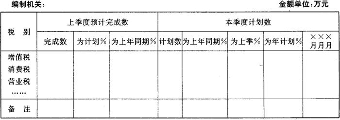 | 释义 | 税收计划的执行 税收计划一经批准下达后,就要层层落实,积极组织实现。税务机关担负组织国家收入的重要任务,不论是中央税收收入,还是地方税收收入,都必须保证完成。税收计划不仅要全额计算,还要全额下达,全额考核。税收计划的执行,是组织税收计划的实现工作,这是把计划的可能性变成现实性的必经步骤。只有做好税收计划的执行工作,才能顺利实现税收计划所规定的税收收入任务,也才有可能从财力上保证国家各项任务的完成。 一、税收季度执行计划 季度执行计划是年度税收计划的短期安排。编制季度执行计划首先是实现年度税收计划的需要。因为税收计划的实现,不是一个自发的过程,需要各级税务机关根据每个季度经济发展的具体情况,提出积极可靠的季度税收收入指标,作为季度内的奋斗目标。编制季度执行计划,以季保年,有利于年度税收计划的实现。其次,编制季度执行计划也是国家预算季度收支平衡的需要。国家预算收入中,90%以上是税收收入,每个季度究竟能组织多少税收收入,对国家预算季度收支平衡至关重要。当税收收入增加了,需要多安排些支出;当税收收入减少了,需要相应减少支出。税收季度执行计划的编制,可以根据近期经济发展的情况,安排今后三个月的税收计划,以利于国家预算季度计划的编制和执行。 季度执行计划采用自下而上提出计划数,自上而下核定下达执行。基层征收单位应按照市、县税务局年度、季度计划的要求,编制短期的收入计划,落实执行。季度执行计划的格式如表6-2-1。 表6-2-1 一九××年税收季度执行计划表