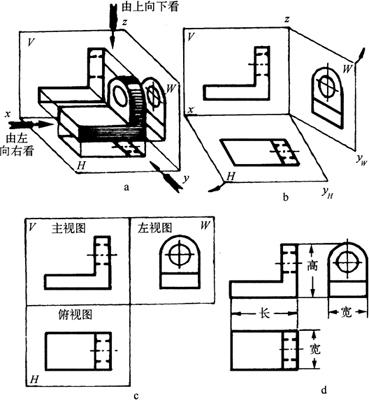 图4-6 正投影原理 物体一面的投影只能反映一个面的形状和大小,并不能表示整个物体的全貌。把物体放在相互垂直的三个投影面上,从前方、上方、左方向投影面投影,便得到物体三个方向的视图,分别表示三个面的形状与大小,即为“三视图”。 图4-7表示了三视图的形成过程。正面(V)上的投影称主视图,即由前向后看画出的图;水平面(H)上的投影图为俯视图;是由上向下看画出的图;右侧面(W)上的投影图是左视图,为由左向右看画出的图。