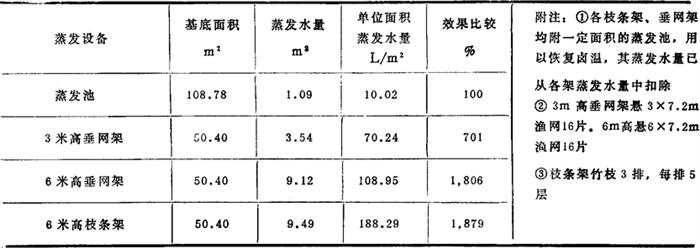 | 释义 | 立体蒸发 立体蒸发是将卤水泵至一定高度的设备上,使之分散成线状、滴状下落,扩大水与空气接触的界面,以提高蒸发效果。常用设备有枝条架与垂网架。 轻工业部制盐研究所曾对这两种设备的蒸发效果与蒸发池的蒸发效果进行对比试验,结果见表2-4-52。 表2-4-52 枝条架、垂网架与蒸发池蒸发效果对比试验