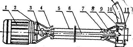 图5-10 立式泥浆泵结构示意图 1.电动机;2.电机座;3.连轴节;4.轴承盒;5.轴管;6.主轴;7.泵座;8.填料盆;9.叶轮;10.输出橡胶管;11.泵壳 (1)用途 ①在农村主要用作河泥、粪便、河水、浆饲料的吸送浇洒,代替肩挑人担,并作排涝、抗旱之用,亦可进行车浜头、上河泥等积肥生产。还可用作农村简易流动消防水泵。 ②可用于市政、化工、印染、医药、造船、铸造、食品等行业抽吸浓稠液、污浊液、湖状体、流砂及城市河道的流动污泥等;亦可用作煤矿排除含有泥块小砾石的流体。 ③若与高压水泵、水枪配合,组成水力机械化土方工程机组,就可用作于土地平整,河道与池塘的疏浚、凿开等小型水利工程的挖方与输方,以及城市的防空工程,地下工程。 (2)结构 本泵系单级单吸立式离心泵,流体沿泵轴的轴线成70°方向流出,主要部件有蜗壳、叶轮、泵座、轴、支撑筒、电机座、电动机等。蜗壳、泵座、电机座、叶轮螺母是生铁铸造,耐磨性、耐腐蚀性较好,加工工艺方便。 叶轮为三片单圆弧弯叶,选用半封闭叶轮和平衡孔,并采用可锻铸铁,所以强度高,耐腐蚀,加工方便,通过性好,效率高。 为了减轻重量和减少车削量,泵轴是优质碳素钢冷拉圆钢制造。 泵座中装有四只骨架油封和轴套,防止轴磨损,延长轴的使用寿命。 本泵可垂直或倾斜使用,占地面积小,蜗壳需埋在工作介质中工作,容易启动,不需引水,旋转方向应从电机尾部看是顺时针向方向工作。 本泵的配套动力是立卧两用电动机,在必要时可拆下电动机卧式安装,拖带其他机具。 总机长度备有各种规格,以便使用单位根据用途因地制宜地选用。 (3)使用须知 ①本泵使用电源必须是三相四线制,若无接地线,必须加装,以防漏电。工作时,须在就近装有与电机相符的电路熔断器和开关,以防叶轮杂物卡死时烧坏电机。 ②本泵使用时可不必安装任何基础装置即能运转,只要斜靠牢固即可,必要时用绳索系牢以防意外。起动后必须检查电机旋转方向,不得反转超过一分钟。 ③当被吸送的液体中含有较多的杂草、铁丝、木条、砖块等杂物时,必须事先尽量清除掉,并可采取加放铁丝篮等方法,防止杂物吸入泵内造成叶轮打坏、卡死和管道阻塞等事故。 ④泵体在吸泥及其他污浊物后应给予短期吸水,以便冲洗泵体及管道内部。 ⑤在露天工作时,电机应装护罩,以防雨水等浸入电机。 ⑥在河底、池底吸泥宜吊挂在三脚架上,并可搁在浮筒或船上移动作业,在进行土方工程作业时,高压水枪冲碎的土块直径不得大于吸入口1/3。 ⑦本泵规定的转速是泵的最高转速,不得任意提高;减低转速使用不限,但功效显着降低。 ⑧本泵在吸送厚泥、浓稠液体或高扬程、长距离输送泥浆时,负荷会降低,但不能用改变结构的方法来增大负荷。 ⑨一般运转1250小时左右,进行泵的定期保养,拆卸泵座查看轴承和泵的密封情况,清洗并更换零件的注意事项请见安装。 ⑩当长期停止使用时,应将蜗壳拆开,擦干零件并在相对运动接合表面涂以薄油,存放在干燥地方以备以后使用。 (4)拆卸 ①拆卸电机或固定板,出水管。 ②拆卸蜗壳和叶轮螺母,轻撬叶轮背面,拆叶轮键。 ③拆卸从动半联轴器,再拆卸键,然后把电机座拆卸,与支撑筒分离。 ④拆卸泵座与支撑筒螺栓,使其分开。 ⑤从轴上拆卸轴套与轴承。 (5)安装 ①对所有零件进行检查是否有缺损,所有纸垫两面都要涂一层薄黄油。 ②骨架油封必须注满黄油后放入泵座,再装上轴承,并在轴承内加上2/3黄油。 ③轴套内装上O型密封圈后涂上黄油。 ④把轴承盖装在电机座上,装上轴承并加上2/3黄油;放上纸垫、挡油圈,装上轴与支撑筒用螺钉固定。 ⑤放上纸垫,装上泵座、轴套、键和叶轮,旋紧叶轮螺母,放平装配件。 ⑥用木锤或铅鎯头敲击泵轴,使轴肩顶住轴承,拆卸轴承盖,用纸垫调正,装好轴承盖,使轴向串动大于0.5毫米,用一只手指拨动叶轮,使其灵活旋转。 ⑦放上纸垫装上泵壳,用螺钉固定并装好滤网。然后再用手指拨动叶轮,转动灵活即可,竖立装配件。 ⑧泵轴上装上键和从动联轴器,在电机轴上装上键与主动联轴器,然后将电机与电机座用螺栓固定。装好后要求主动联轴器与从动联轴器之间轴向间隙应为1-1.5毫米。 (6)泵主要技术规格见表5-9。 表5-9 泵主要技术规格