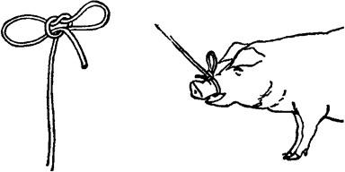 | 释义 | 站立保定 (一)缚鼻保定法 1.鼻勒保定法 取一根粗1cm、长3~4m的结实柔软的细绳,在绳的一端系一双活结(双活结的结法:两手握绳,左手掌向上,右手掌向下,两手都向右转,到两掌心相对时绳子形成两个圈,将两个圈并拢,并将两圈的内侧绳相互穿过对方的绳圈,拉紧后即成),将双活结的长绳圈套在猪上颌犬齿后面的齿槽间隙内,用力拉紧长绳即可(图5.1.1)。解脱猪只时只要拉短绳头,绳圈即可全部松解。本法简单易行,且猪鼻被勒后,只往后退,拒不前进,绳套不会松脱,故保定牢固。
