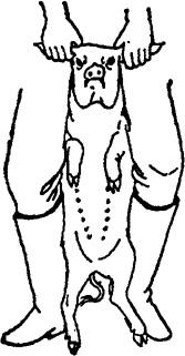 图5.1.3 竹制鼻捻棒 (二)提耳保定法 适用于体重25kg以下的猪的针灸保定。保定者两手分别紧握猪只的两个耳朵,两腿骑夹在猪的鬐甲部,然后两手用力向上提拉猪耳,使猪头高抬、两前肢悬空,再用两腿紧紧夹定猪的肩肘部(图5.1.4)。
