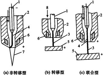 图6-7 等离子弧类型 1-钨极;2-喷嘴;3-转移弧;4-非转移弧;5-工件;6-冷却水;7-弧焰;8-离子气 等离子弧焊焊接原理见图6-8。焊枪中的钨极处于喷嘴的中心位置,形成电弧等离子体的是氩气,外层保护气体可用氩气,也可用氩气+氢气的混合气。