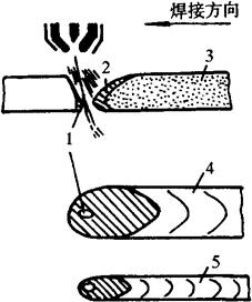 图6-8 小孔等离子弧焊焊缝成形过程 1-小孔 2-熔池 3-焊缝 4-焊缝正面 5-焊缝反面 表6-1 小孔等离子弧焊一次穿透的厚度