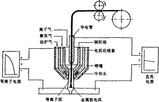 注:不加衬垫,单面焊双面成形。 2.熔透型等离子弧焊 也称熔入型、熔融型等离子弧焊。是离子气流量较小,弧柱压缩程度较弱的一种等离子弧焊。在焊接过程中,只熔化工件,不产生小孔效应。焊缝成形过程与钨极氩弧焊相类似,随着焊枪向前移动,熔池金属凝固形成焊缝。它适用于单面焊双面成形和厚板多层焊。 3.微束等离子弧焊 又称针状等离子弧焊,是指30A以下的熔透型等离子弧焊。为了提高等离子弧的稳定性,采用小孔径压缩喷嘴( 4.熔化极等离子弧焊 是等离子弧与熔化极电弧焊相组合的一种焊接方法。与等离子弧焊比较,其优点是:焊丝受等离子弧预热,熔化功率大,焊接速度高。熔化功率和工件上的输入热量可以单独调节。熔化极直流电源,采用直流反接时有去除氧化膜的阴极破碎作用,所以这种方法适用于焊铝、镁及其合金。 熔化极等离子弧焊有两种基本形式。图6-9为水冷喷嘴式。水冷喷嘴在强烈的直接水冷条件下,可以承担较大的等离子弧电流。在焊枪体中间送入一熔化极,熔化极与工件间接一直流电源。熔化极电弧在等离子弧中间燃烧。等离子弧起到预热熔化焊丝的作用,因此熔敷率很高,适用于堆焊。图6-10为钨极式熔化极等离子弧焊。在钨极与工件之间接有直流电源和高频引弧器,等离子弧在钨极与工件之间燃烧。熔化极与工件之间接直流电源,熔化极电弧在等离子弧中燃烧。在焊接导热性强的金属材料时,还可以在工件和喷嘴之间加一降压特性直流电源加热工件。