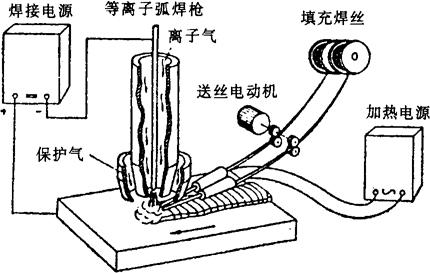 图6-10 钨极式熔化极等离子弧焊 5.热丝等离子弧焊 为提高熔敷速度,用一单独的平特性交流电源加热填充焊丝,交流电源可以减弱磁偏吹,对稳定电弧有利。为提高生产率可以采用双丝和多丝输送。图6-11是双丝热丝等离子弧焊的示意图,这种方法适用于堆焊。