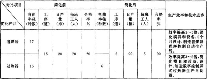 4.简化零部件结构要素。零部件是由许多结构要素构成的。零件的加工实际上是形成一系列结构要素,如直径、长度、圆弧、凹槽、螺纹、齿形及其他结构尺寸要素的过程。加工这些结构要素需要一系列设备、刀具、卡具、测量工具。简化合并结构要素就可以节省一系列设备和工卡量具,降低研制和生产准备周期与成本,达到良好的经济效益。 如哈尔滨锅炉厂分析了火力发电设备用锅炉上119种省煤器和161种过热器,对蛇形传热管的弯曲半径进行简化,推动了自动化生产,提高了生产效率。表3.2-2是简化前后生产效率的对比。 表3.2-2 锅炉传热蛇形管和弯头弯曲半径简化前后效率对比
