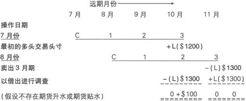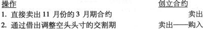 在11月份进行的交易有效地抵消了原有头寸。在现实中,合约会被完整地记录,因为它们各是两个单独交易的一部分。当然,操作1和操作2可以由不同的经纪人对不同的交易相对方做出。下面的例子将进一步说明上述情形。 尽管经纪人进行着3个合约的交易,但客户只得到一个其所希望的交割期头寸。 例 某客户在7月买入100公吨3月期货,交割期是10月。一个月后,他决定卖出相同数量合约以结束其当前的交易头寸。