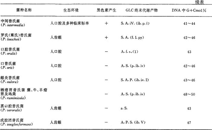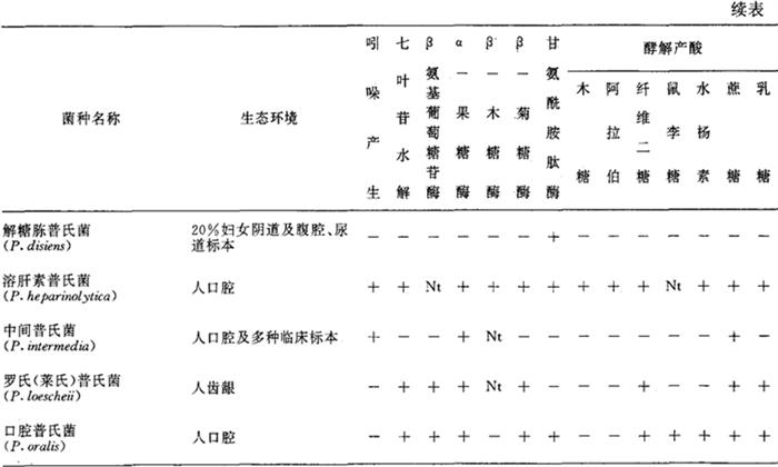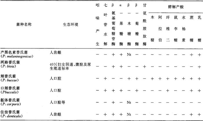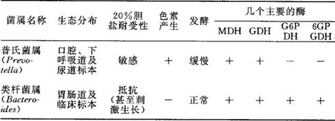 注:MDH为苹果酸脱氢酶;GDH为葡萄糖脱氢酶;G6PDH葡萄糖6磷酶脱氢酶;6GPGDH为6-磷酸葡萄糖脱氢酶 3.普氏菌属(Provotella) 普氏菌属是新增加的革兰氏阴性无芽孢厌氧杆菌属,包括16个菌种。这些菌种主要分离自口腔、阴道和牛羊瘤胃及粪标本中,也可从呼吸道、齿龈、阴道、腹腔或盆腔的临床标本中分离,其中有5个菌种产生黑色素。这些菌种原属于类杆菌属,根据其DNA中G+Cmo1%及同源性测定,已证实其属于新的菌属即普氏菌属,鉴别特征见表4-4。 表4-4 普氏菌属主要菌种的鉴别