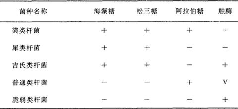 5.类杆菌属新增加3个菌种的主要鉴别特征 列于表4-7;粪类杆菌与吉氏类杆菌等鉴别列于表4-8中;便类杆菌与多形类杆菌的主要鉴别特征列于表4-9。 表4-7 类杆菌属新增加3个菌种的主要特征