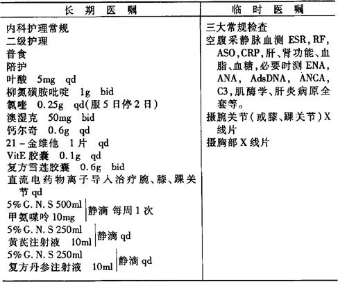 说明:(1)治疗类风湿关节炎(RA)的改善病情药(DMARDs)有多种联合用药方案:如①MTX(甲氨喋呤)+Ridaura(瑞得)3mg每日2次,可连用1~3年;②MTX+D-PA(青霉胺)第1周0.125g/d,第2周0.25g/d,第3周及以后0.375g/d,可连用1~3年;③MTX+CsA(环孢素A)50mg每日2次,可连用3~6个月。以上方案根据病情和病人的治疗反应酌情选用,用药期间应每月检测血常规,每2~3个月检测肝、肾功能,异常者应减量使用或停止用药;要注意有无其他合并症或并发症,及时发现,及时处理。 (2)非甾体抗炎药物(N.SAIDs)对快速改善病人的症状有效,但它们不能改善病情,不宜单独使用。常用的N.SAIDs有:阿司匹林1g,4次/d;布洛芬0.2~0.4g,2次/d;吲哚美辛25~50mg,1~2次/d;双氯芬酸25~50mg,2次/d等。 (3)中成药、中药方剂有助于快速改善患者的症状和体质,可酌情加用。如雪莲花口服液、雷公藤片、疏风活络片、金菌灵胶囊等均为治疗RA的中成药。 (4)强直性脊柱炎、银屑病关节炎、瑞特综合征的治疗方案可参照RA的治疗方案执行。 |
