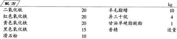 将二氧化钛、氧化铁、滑石粉用混料机粉碎成粉末,将其余成分混合,加热熔化,均匀地加入粉末中,再用粉碎机处理,压制成型。按需要制成不同形状的块状眉笔。