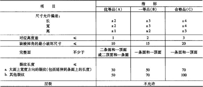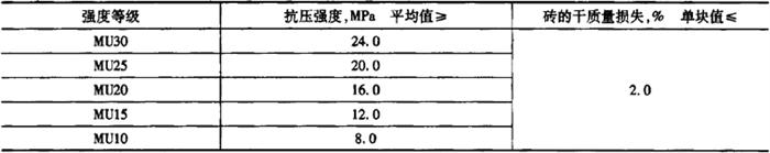 注:在条面或顶面上破坏面的两个尺寸同时大于10mm和20mm者为非完整面。 (2)色差 色差应不显着。 (3)强度等级 强度等级应符合表3-31的规定,优等品砖的强度等级应不低于MU15。 表3-31 粉煤灰砖强度指标MPa
