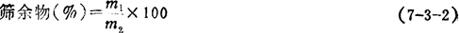 3.测定手续 称取100.0g样品,置于所规定的筛网中,盖上筛盖,人工(或振荡器)振荡3min后,用软毛刷扫净筛网壁边沿,继续振荡1min,将筛上残留部分移入已知重量的烧杯中称量。