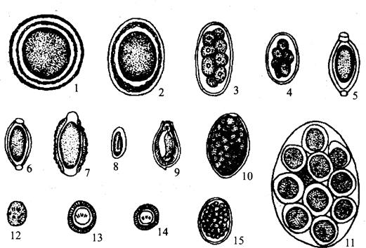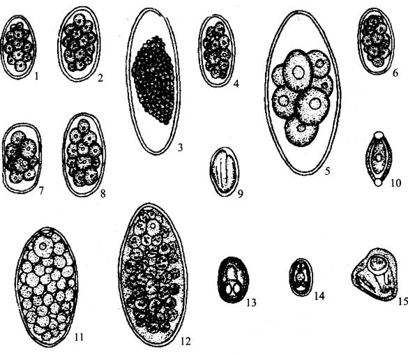 图1-20(六) 犬体内的寄生虫虫卵形态 1.犬蛔虫卵 2.狮蛔虫卵 3.犬钩虫卵 4.巴西钩虫卵 5.犬鞭虫卵 6.毛细线虫卵 7.肾膨结线虫卵 8.血色食道线虫卵 9.华支睾吸虫卵 10.并殖吸虫卵 11.犬复孔绦虫卵 12.线中绦虫卵 13.泡状带绦虫卵 14.细粒棘球绦虫卵 15.裂头绦虫卵 |
