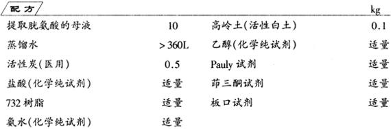 制法 (1)处理 将提取胱氨酸的母液(即提取胱氨酸时过滤出的滤液)移入反应锅中,加热至80℃,真空浓缩至膏状,加20L蒸馏水,在搅拌下再加入0.3kg的活性炭,加热到90℃左右,保温脱色3~4h,待冷至室温后,滤除活性炭,收集澄清的滤液于搪瓷缸中,加入40L水稀释。 (2)吸附 将稀释滤液用10%的盐酸调节pH值为2.5,然后在732树脂交换柱中进行吸附,用Pauly试验检查流出液,直到组氨酸出现(已被氨基酸饱和),停止上柱。 (3)清洗 用蒸馏水冲洗树脂柱,待流出液pH值达5~6时,停止洗涤。 (4)洗脱 将以上清洗干净的柱用0.1mol/L的氨水洗脱,用Pauly试剂检查柱下端流出液呈橘红色时,收集组氨酸洗脱液。当洗至组氨酸明显减少,而茚三酮反应呈阳性时,收集赖氨酸洗脱液,直至洗脱液无茚三酮反应为止。 换用2mol/L氨水洗脱,用板口试剂检查洗脱液,待有精氨酸出现时,开始收集,至无茚三酮反应和板口反应时,停止收集。 (5)精制 ①组氨酸的精制 将组氨酸洗脱液用减压浓缩至无氨味,蒸干后用200L蒸馏水溶解,用10%的盐酸调节pH值为3.0~3.2,加入0.1kg活性炭,于90℃左右搅拌脱色40min,冷却后脱掉活性炭。滤液中再加入0.1kg的高岭土(活性白土),加热到60~70℃,保温30min,过滤。将滤液减压浓缩至结晶析出,于4℃冰箱中放置2d,然后滤出结晶,用乙醇洗涤3次,抽滤至干,干燥后即得产品。 ②赖氨酸或精氨酸的精制 将洗脱液减压浓缩至无氨气味,浓缩至干。用50倍左右蒸馏水溶解,以10%的盐酸调节pH值为3.8~4.2,加入0.1kg活性炭,于90℃左右脱色40min,冷至室温后滤去活性炭。滤液再减压浓缩至黏稠状,冷至室温,待有结晶析出时,搅拌30min左右,静置后,分出结晶,分别用75%和95%乙醇各洗一次,抽滤干燥,即得赖氨酸盐结晶或精氨酸盐结晶。 赖氨酸和组氨酸是人体必需的氨基酸;精氨酸为半必需氨基酸,它在临床和医药上具有重要的价值。 |