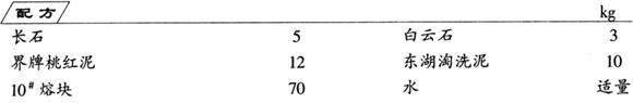 制法 将固体物料粉碎,加水研细,制成釉料,供施釉用。 不同的厂家采用不同的釉料配方及化学成分,同样可采用制釉工艺制成釉料,供施釉用,下面是国内一些厂家的釉料配方。 6-1 湖南铜官陶器枣红釉料配方:长石4.91%,方解石26.93%,坪塘黄泥58.85%,锰粉9.31%。其化学组成为:SiO2 48.01%,Al2O3 7.64%,Fe2O3 3.09%,CaO 18.40%,K2O 1.09%,Na2O 0.16%,MnO 4.72%。 6-2 湖南铜官陶器黑釉配方:枣红釉30%,洪湖潮泥70%。其化学组成为:SiO2 56.84%,Al2O3 13.06%,Fe2O3 5.54%,CaO 6.79%,MgO 2.64%,K2O 2.28%,Na2O 1.08%,MnO 0.55%。 6-3 江苏宜兴陶器嫩红釉配方:白土(含钾钠易熔黏土)60%,土屑(一种水针铁矿)16%,方解石24%。其化学组成为:SiO2 43.89%,A12O3 9.80%,Fe2O3 9.69%,CaO 14.61%,MgO 0.56%,K2O+Na2O 5.37%。 6-4 江苏宜兴陶器绿釉配方:含钙易熔黏土48.5%,玻璃6.0%,方解石9.0%,铜灰24.2%,石灰窑窑渣12.3%。其化学组成为:SiO2 46.49%,Al2O3 9.87%,Fe2O3 2.94%,CaO 11.62%,MgO 1.19%,K2O+Na2O 2.89%,CuO 12.96%。 |