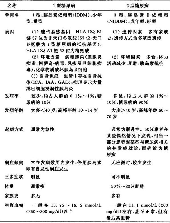 | 释义 | 糖尿病 【释义】: 糖尿病(diadetes mellitus)是因胰岛素分泌、胰岛素作用或两者同时存在缺陷所致的以慢性高血糖伴有糖类(碳水化合物)、脂肪和蛋白质代谢紊乱为特征的一组代谢性疾病。糖尿病对人体的长期影响主要是造成各种器官的功能损伤,包括不断进展的血管性疾病(即可引起失明的视网膜病变,引起肾功能衰竭的糖尿病肾病,及不断增加的心血管、脑血管和周围血管病的危险)和神经病变(可累及周围神经和自主神经)。糖尿病最严重的急性并发症是酮症酸中毒及高渗性昏迷,危害健康,甚至生命。 【诊断】: 1.临床表现 典型者有“三多一少”症状,即多饮、多尿、多食、消瘦,不少患者缺乏典型临床症状,表现为反应性低血糖,或某些急慢性并发症的症状。 2.辅助检查 (1)血糖测定 空腹及餐后血糖升高是诊断糖尿病的主要依据。空腹静脉全血血糖(真糖法)的正常值为3.3~5.6mmol/L(60~100mg/dl),血浆血糖正常值为3.9~6.4mmol/L(70~110mg/dl)。 (2)口服葡萄糖耐量试验 可疑糖尿病,空腹及餐后血糖增高但未达到糖尿病诊断标准者应行此试验。成人采用75g葡萄糖负荷,儿童1.75g/kg,正常人血糖高峰出现于服糖后1/2~1h,峰值不超过8.9~10mmol/L(160~180mg/dl)。 (3)空腹血浆或血清胰岛素及C肽测定 采用放射免疫法测定的胰岛素包括胰岛素原及与抗体结合的胰岛素。C肽测定不受胰岛素抗体影响,不与胰岛素产生交叉免疫反应,也不受外源性胰岛素干扰。1型糖尿病空腹血浆胰岛素和C肽水平很低,2型糖尿病则多为正常或增高。 (4)胰岛素或C肽释放试验 本试验的方法与OGTT相同,只是于空腹,服糖后30,60,120,180min时采血同时测胰岛素或C肽,以直接了解胰岛β细胞的功能状态。正常人血胰岛素和C肽的高峰与血糖高峰一致,于服糖后30~60分钟胰岛素测值为空腹的5~10倍,C肽测值为空腹的5~6倍。1型糖尿病患者糖负荷后无胰岛素和C肽释放反应峰,其释放曲线呈低平状态;2型糖尿病肥胖患者,糖负荷后胰岛素和C肽释放反应峰值正常或增高,但高峰却在2h后延迟出现;病程已久消瘦2型糖尿病患者胰岛素和C肽的释放反应峰值低于正常。 (5)糖基化血红蛋白测定 糖基化血红蛋白(GHb)含量与血糖浓度呈正比,可反映2~3个月前体内血糖的平均水平。糖基化血红蛋白的主要成分为HbAlc,因此常以HbAlc代表GHb。GHb(或HbAlc)的测值因测定方法不同而略有差异,约在3.6%~6.3%的范围之内。未控制的糖尿病患者GHb可为正常人的2至3倍。 (6)糖化血清蛋白测定 葡萄糖与血清蛋白和其他蛋白质亦可发生非酶糖化反应,使白蛋白等蛋白质N-末端上形成酮胺结构,类似果糖胺,因此又将糖化血清蛋白测定称为果糖胺测定,其含量亦取决于血糖浓度,可反映受试者2周前的血糖平均浓度。正常值依方法和实验室不同略有不同,需参照各实验室制定的标准。 (7)自身抗体测定 自身抗体包括胰岛细胞抗体(ICA)、胰岛素抗体(IAA)及谷氨酸脱羟酶(GAD)抗体测定。1型糖尿病患者血清中该三种抗体可同时存在,亦可仅测到1~2种。三种抗体中GAD存在的时间较长,于发病10余年后仍可测到该抗体。 (8)其他检查 有关糖尿病并发症的实验室检查,包括血脂、血黏度;脑、心、肾血管病变及功能检查见有关章节。 3.糖尿病的诊断标准 1996年ADA提出的新诊断标准,见表8-2。 表8-2 ADA糖尿病诊断新标准(1996年)