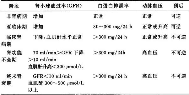(3)并发症的诊断 1)急性糖尿病并发症 a.感染 (a)皮肤感染 癣、疖、痈,有时可酿成败血症。 (b)结核 肺结核多见,扩展快,多病灶,易形成空洞,患病率比正常人高3~5倍。 (c)泌尿系统 下尿路感染、肾盂肾炎、膀胱炎、坏死性肾乳头炎;真菌性阴道炎、外阴炎。 (d)其他 胆囊炎、牙周炎、齿龈溢脓、鼻窦炎等。 b.酮症酸中毒 见8.29糖尿病酮症酸中毒节。 c.高血糖高渗综合征 见8.30高血糖高渗综合征节。 2)慢性糖尿病并发症 慢性并发症是长期代谢控制较差的结果,同样与遗传和环境影响有关。慢性并发症分为微血管并发症和大血管并发症。微血管并发症是糖尿病特有的,一般不发生在无长期高血糖的非糖尿病患者中。大血管并发症不是糖尿病特有的,但却是糖尿病患者中最常见的。与正常人比较,大血管并发症在糖尿病中的发生年龄较轻,病变范围更广,程度更为严重。 a.微血管并发症 (a)视网膜病变 糖尿病视网膜小血管损伤,引起糖尿病视网膜病变,是青年糖尿病患者引起失明最普遍的原因,也是使糖尿病患者致残的重要并发症。 糖尿病视网膜病变的分类: ●非增殖性视网膜病变 表现为微小动脉瘤、点片状出血、硬性渗出、黄斑水肿。 ●增殖前期视网膜病变 表现为软性渗出(视网膜梗塞)、视网膜内微血管的异常。 ●增殖性视网膜病变 表现为新生血管形成、出血及视网膜剥离。 (b)糖尿病肾病 糖尿病肾病是累及肾小管和肾小球的病变,通常在糖尿病发生15~20年后出现,其自然病程开始于微量白蛋白尿(30~300mg/24h),并可发展为显性蛋白尿,血压升高,肾功能下降,若不积极治疗,部分患者最终进入终末期肾功能衰竭而死亡。糖尿病肾病的分期如表8-4所示。 表8-4 糖尿病肾病分期