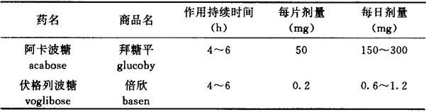 ●糖尿病酮症酸中毒、高渗性昏迷、严重感染时及糖尿病患者伴心衰、肝肾功能衰竭、慢性肺部疾病、组织缺氧、酗酒等均禁用双胍类药物,因易引起乳酸性酸中毒。糖尿病患者在妊娠期间亦不能应用双胍类药物。 ●双胍类主要的不良反应是消化道反应,有食欲不振、恶心、呕吐、腹痛及腹泻等。因其促进肌肉中糖的无氧酵解,产生大量乳酸,机体缺氧时易致乳酸中毒,应引起重视。 3)α-糖苷酶抑制剂 该类药物的降糖机制是抑制多糖或双糖转变为单糖,延缓葡萄糖在肠道的吸收从而降低餐后血糖并兼有减轻胰岛素抵抗的作用。该类药物的适应证很广,可单独或与双胍类同用于肥胖的2型糖尿病患者;与磺脲类或与磺脲类、双胍类联合用于仅用磺脲类血糖控制不理想的2型糖尿病患者;与胰岛素合用于1型和2型需用胰岛素患者,不仅可减少胰岛素用量还有助于减轻餐后早期高血糖及餐后晚期低血糖(表8-9)。 表8-9 常用α-糖苷酶抑制剂