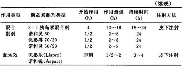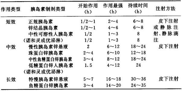 ●糖苷酶抑制剂的使用应从小剂量开始,逐渐增加剂量,并与第一口饭一起嚼碎咽下。 ●糖苷酶抑制剂的主要不良反应是消化道反应,表现为腹部胀满、胀气、肠鸣音亢进和排气过多,少数患者有腹泻或便秘。这些症状多在服药2周左右缓解,仅少数患者不能耐受而停药。 ●原有消化不良、消化道溃疡、肠梗阻倾向、感染、恶性肿瘤、酗酒、严重肝肾功能损害者禁用糖苷酶抑制剂。妊娠或哺乳妇女及小儿不宜使用。 4)中药 消渴丸、渴乐宁、金芪降糖片等。 (2)胰岛素治疗 1)适应证 a.1型糖尿病。 b.2型糖尿病病程久,胰岛功能衰竭或用口服降糖药物不能理想控制血糖者。 c.糖尿病患者在发生酮症酸中毒、高渗性昏迷、乳酸中毒、严重感染、创伤、大手术前后。 d.糖尿病患者并发进行性视网膜病变、神经病变、肾脏损害、急性心肌梗死、脑血管意外、严重足溃疡及下肢坏疽等。 e.糖尿病伴慢性肝、肾功能不全;慢性消耗性疾病如结核和肿瘤等。 f.糖尿病妊娠或分娩时。 2)制剂类型 以往用于糖尿病治疗的胰岛素主要为猪和牛的胰岛素,目前基因工程合成的人胰岛素已广泛用于临床。各类胰岛素制剂的特征见表8-10。 表8-10 常用胰岛素制剂