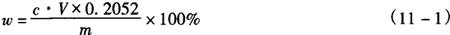 分子式:C7H4O3NSNa·2H2O 相对分子质量:241.19 一、糖精钠的鉴别 1.试剂 1.1 间苯二酚。 1.2 硫酸。 1.3 氢氧化钠 40g/L溶液。 1.4 盐酸 100g/L溶液。 2.仪器 一般实验室仪器。 3.操作步骤 3.1 取试样约20mg,加间苯二酚约40mg,混合后加硫酸10滴,用微火加热,至显深绿色,放冷,加水10mL与过量的氢氧化钠溶液即成绿色有荧光的溶液。 3.2 取铂丝,用盐酸湿润后,蘸取试样,在无色火焰中燃烧,火焰即显鲜黄色。 3.3 熔点测定 按《中华人民共和国药典》1977年版熔点测定法规定。取试样约0.3g,加水5mL溶解后,加稀盐酸1mL,即析出结晶,过滤,滤渣用水洗净,经105℃干燥后,测定其熔点应为226~230℃。 二、糖精钠的含量测定 1.试剂和溶液 1.1 冰乙酸。 1.2 乙酸酐。 1.3 结晶紫指示液 0.5%乙酸溶液。 1.4 无水乙酸 取冰乙酸适量,按含水量计算1g水加乙酸酐5.22mL即得。 1.5 高氯酸 0.1mol/LHClO4标准溶液,按GB601配制。 2.仪器 一般实验室仪器和自动滴定管(25mL)。 3.测定方法 取干燥失重测定后试样0.3g,称准至0.0002g,加入乙酸酐5mL,溶解后,加2滴结晶紫指示液,用0.1mol/LHClO4溶液滴定至蓝绿色。 4.分析结果的表述 糖精钠质量分数(w),按式(11-1)计算: