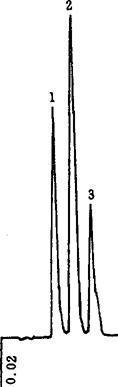 图11-1 高效液相苯甲酸、山梨酸、糖精钠色谱图 1-苯甲酸 2-山梨酸 3-糖精钠 (二)薄层色谱法 1.原理 在酸性条件下,食品中的糖精钠用乙醚提取、浓缩、薄层色谱分离,显色后与标准比较,进行定性和半定量测定。 2.试剂和溶液 2.1 乙醚 不含过氧化物。 2.2 无水硫酸钠。 2.3 无水乙醇及乙醇(95%)。 2.4 聚酰胺粉 100~140目。 2.5 盐酸(1+1) 取100mL盐酸,加水稀释至200mL。 2.6 展开剂。 2.6.1 正丁醇+氨水+无水乙醇(20+1+1)。 2.6.2 异丙醇+氨水+无水乙醇(20+1+1)。 2.7 显色剂 称取0.040g溴甲酚紫溶于100mL50%乙醇溶液,用1.2mL0.4%氢氧化钠溶液调至pH8。 3.仪器 3.1 吹风机。 3.2 层析缸。 3.3 玻璃板5cm×20cm。 3.4 微量注射器10μL。 3.5 玻璃喷雾器。 4.测定方法 4.1 样品提取。 4.1.1 饮料、果酱:称取2.5g(mL)已经混匀的样品(汽水需加热去除二氧化碳),置于25mL带塞量筒中,加氯化钠至饱和(约1g),加0.5mL26mol/LHCl溶液酸化,用15mL、10mL乙醚提取2次,每次振摇1min,静止分层,用滴管将上层乙醚提取液通过无水硫酸钠滤入25mL容量瓶中,用少量乙醚洗无水硫酸钠,加乙醚至刻度,混匀。吸取10.0mL乙醚提取液分2次置于10mL带塞离心管中,在约40℃水浴上挥发至干,加入0.1mL无水乙醇溶解残渣,备用。 4.1.2 糕点:称取2.5g糕点样品,研碎,置于25mL带塞量筒中,用石油醚提取3次,每次20mL,每次振摇3min,弃去石油醚,让样品挥干后(在通风橱中不断搅拌样品,以除去石油醚),加入0.5mL6mol/LHCl溶液酸化,再加约1g氯化钠,以下按4.1.1自“用15mL、10mL乙醚提取2次……”起依法操作。 4.2 测定。 4.2.1 聚酰胺粉板的制备:称取4g聚酰胺粉,加1.0g可溶性淀粉,加约14mL水研磨均匀合适为止,立即倒入涂布器内制成面积为5cm×20cm,厚度为0.3mm的薄层板6块。室温干燥后,于80℃干燥1h,取出,置于干燥器中保存、备用。 4.2.2 点样:薄层板下端2cm的基线上,用微量注射器于板中间点4μL样品溶液,两侧各点2μL、3μL糖精钠标准液。 4.2.3 展开与显色:将点样后的薄层板放入预先盛有展开剂(2.6.1或2.6.2)的展开槽中,展开槽周围贴有滤纸,待溶剂前沿上展至10cm以上时,取出在空气中挥干,喷显色剂其斑点成黄色,背景成蓝色。样品中糖精钠的量与标准斑点深浅比较定量(用2.6.2展开剂时,糖精钠的比移值为0.31,环己基氨基磺酸为0.47,苯甲酸为0.61,山梨酸为0.73)。 5.分析结果的表述