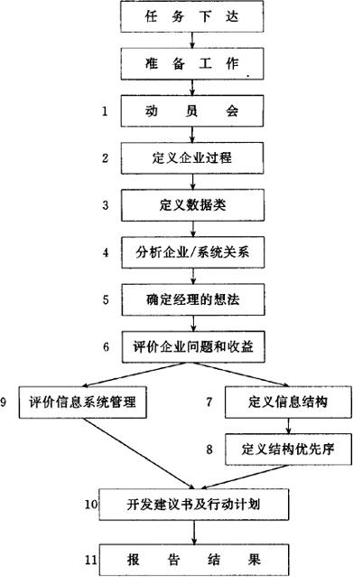 图7.2-1 BSP方法步骤 BSP方法是把企业目标转化为信息系统(IS)战略的全过程。BSP方法所支持的目标是企业各层次的目标,实现这种支持需要许多子系统,进行BSP工作大致有以下步骤,见图7.2-2。