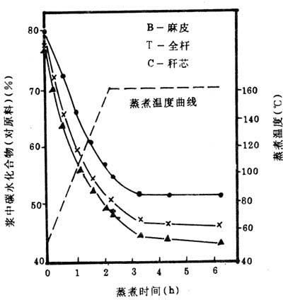①升温阶段:对碳水化合物的破坏最厉害,浆中碳水化合物含量迅速下降。到最高蒸煮温度165℃时,碳水化合物溶出率分别为:全秆34.8%,秆芯37.2%,麻皮31.0%。