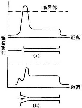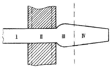图11-1 液体细流形成的分段图 Ⅰ-为入口段 Ⅱ-为恒定流动段 Ⅲ-细流出口段 Ⅳ-细流受力变形段 由图11-1可知:第一区为入口段,即液体进入孔道;第二段为液体在孔道中恒定流动;第三段为液体细流出口段;第四段为细流受外力作用发生形变,和纺丝细流受冷却介质作用固化成型的阶段。 喷丝孔道的横面形状也将会大大地影响液体的流动过程。若孔道锥形入口的长度达总长的2/3以上时,将有利于液体的流动,减少液体的入口效应,使液体的入口能量损失大大减少,有利于产生均匀的速度场,如图11-2。由图11-2可知,圆柱形入口孔的能量损失比圆锥形的要大得多。