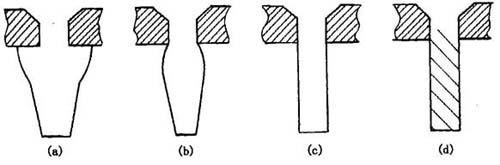 图11-2 喷丝孔的形状与入口能量损失的关系 (a)为圆筒形毛细孔 (b)为锥形毛细孔 纺丝液体在纺丝过程中形成细流的可能性与液体从喷丝孔流出的稳定性有关。影响液体细流稳定的因素有: ①喷丝头表面与液体之间的界面层上的表面张力及液体细流同冷却介质之间的界面上的表面张力。 ②液体流动动能的大小。 ③纺丝液体从喷丝头流出到丝线成型的内张力。 ①液体细流的流变性能及内应力。 在一定条件下,这些因素相互作用的结果保证了液体细流形状的稳定性及流动性。从喷丝孔流出的液体细流可能有四种形状,如图11-3。