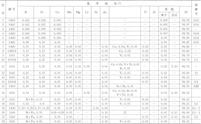 | 释义 | 纯铝的牌号及化学成分 按GB/T 3190-1996规定,变形纯铝牌号命名的基本原则是:可直接采用国际四位数字体系牌号;未命名为国际四位数字体系牌号的变形纯铝采用四位字符牌号;四位字符牌号的第一位、第三位、第四位为阿拉伯数字,第二位为英文大写“A”。纯铝编号系统的第一位为“1”,例如1×××或1A××;最后两位数字表示铝的纯度。纯铝的牌号及化学成分见表9.1-2,表中还列出了相应的原牌号名称。 表9.1-2 纯铝的牌号与化学成分(GB/T 3190-1996)
