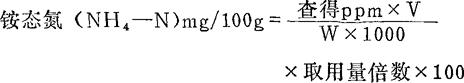 式中:ppm——由待测液的吸光度,在工作曲线上查得的铵态氮浓度(ppm); V——显色液体积(本操作为100ml); 取用量倍数——本操作为 1000——将ppm换算成毫克; W——样品重(g)。 |