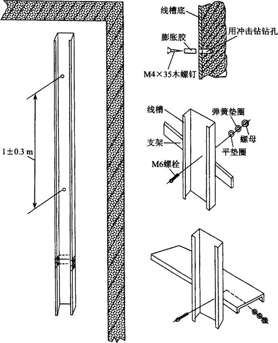 | 释义 | 线槽固定 使用Φ6mm钻头打孔,用膨胀胶和木螺丝将线槽固定在墙壁上,参见图11.2-8。如果井道是金属结构的,也可以使用螺栓将线槽固定在金属构架上,但严禁焊接线槽。