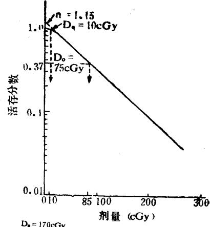 | 释义 | 细胞存活曲线 辐射对细胞群体的效应,即辐照剂量与细胞群体的活存能力(也就是对于生殖死亡的抗拒能力)之间的剂量-反应关系,可借细胞存活曲线得到定量的表达。所观察的细胞群体可以是在体外培养的细胞系,也可以是在体内受到照射后在体内或在体外测试的。 细胞的存活曲线(也称为剂量-存活曲线)是绘制在半对数坐标纸上的。坐标的横轴为算术刻度,从原点向右表示各单次照射剂量的增大;纵轴为对数刻度,表示细胞群体受不同剂量照射后存活的分数。若以照射前的细胞数目作为100%(或以其商1,即100)标示,则照射后的存活分数相当于照前的百分数(或其商,或10的负指数)标示。图2-1为一模式图。图中的曲线是由“肩部”(低剂量范围内的弯曲部分)和“指数部”(较高剂量范围内的直线部分)组成的。曲线中有三个参数:(1)将指数部的直线向左上方延伸,直到与纵轴相交,交点处的纵轴上的数值被称为外推值(n);(2)由存活分数为100向右方引一与横轴相平行的直线,直至与上述延线相交。与这一线段相当的横轴上剂量的大小被称为准阈剂量(Dq);(3)在指数部直线上的任一点向下方绘一与纵轴相平行的垂直线段,使其长度达到相当于起始点数值的37%(即1/e)的那一点为止。然后再由此垂直线终点处向右方引一平行于横轴的水平线,直到与指数部的直线相交。这一水平线的长度所相当的剂量即为平均致死剂量,亦即指数部直线的斜率(D0)。