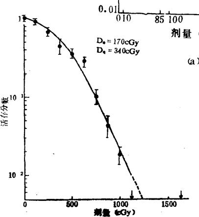注:(1)所列数据都是低LET辐射在不缺氧条件下照射的结果; (2)由于所测定的技术(及细胞系)的差别,不同作者所报道的参数可有很大出入 有些肿瘤的肩部较宽,因而放疗效果不佳,如黑素瘤(图2-3)。再者,肠道的癌对放疗也有抗拒性,这从表2-2中正常小、大肠隐窝干细胞存活曲线中的Dq值较高可以得到说明。