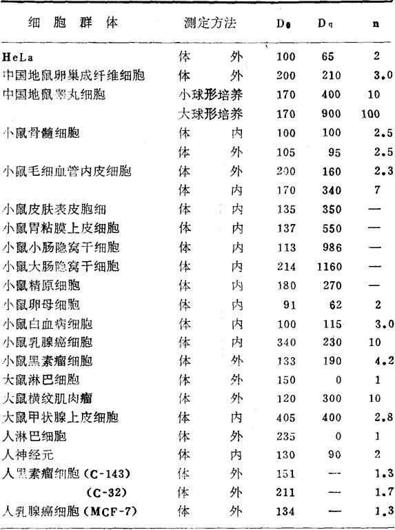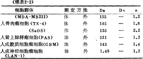 (c) 图2-2 三种细胞群体的存活曲线 (a)为哺乳动物外周血淋巴细胞;(b)为大鼠毛细血管内皮细胞;(c)为小鼠小肠隐窝干细胞。三者Dq值(亦即肩部宽度)相差极为悬殊。 现将已知的哺乳动物和人的正常组织与某些肿瘤组织的有关参数列于表2-2。 表2-2 哺乳动物及人一些正常及肿瘤组织存活曲线的参数值(cGy)