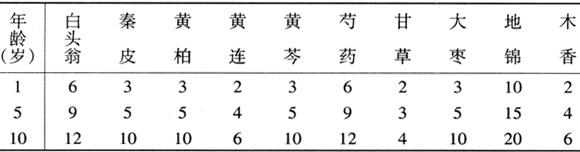 【歌诀】 白头翁汤柏连皮,诸药合用治赤痢。 黄芩汤中枣芍草,治痢和中止痛好。 〔按语〕本方为原方加地、香组成。表中前四味药为白头翁汤,白头翁为主药;芩、芍、草、枣为黄芩汤,黄芩为主药。对表证已解、下痢脓血、赤多白少的患儿可选用本方。方中白头翁清热解毒,凉血治痢,它对志贺菌属中的志贺菌作用较强,对鲍氏、福氏、宋内菌依次减弱或不抑菌;秦皮苦寒而涩,能清湿热而止后重;黄柏泻下焦湿热,其抗痢疾杆菌的有效成分是小檗碱;芍药疏肝止痛;草、枣和中益脾。芩、连、地、香作用同处方一。我们曾用白头翁汤治小儿菌痢,其治愈率为82.3%。 (二)疫毒痢 1.闭证型 〔证候〕多数在未见下痢时,突起高热、烦躁、惊厥、神昏;部分下痢者大便腥臭伴脓血,尿短赤。舌质绛,苔黄腻。脉滑数。指纹紫滞。 〔治法〕清热解毒,开窍熄风。 〔方药〕清营汤(见乙脑节)加钩藤、菖蒲、紫雪丹(其用量及用法见惊厥节)。 〔按语〕清营汤清热解毒、凉血清心;其方解见第四章乙脑节,该方中银花、连翘、黄连对志贺菌属有抗菌作用。加用钩、菖及紫雪丹清热、止痉、开窍。若有腹胀可加枳壳、大黄。大便见脓血者加用白头翁、地锦。 2.脱证型 其辨证论治见第十一章小儿感染性休克节。 (三)脾虚久痢 〔证候〕下痢日久,时作时止,面黄肌瘦,纳差,乏力,大便中多夹黏液而少脓血,或有脱肛。舌质淡,舌体胖,苔白或腻。脉濡。指纹淡。 〔治法〕健脾利湿。 〔方药〕参苓白术散(见第七章腹泻节)加地锦、乌梅。 〔按语〕下痢日久,气血两虚,本型患儿脾虚之证明显,故选参苓白术散补气健脾,调中止泻,健脾和胃。加用辛平的地锦及酸平的乌梅,不伤脾胃,而两者抗志贺菌属的作用较强,故对久痢脾虚的患儿尤宜。对有脱肛者可用补中益气汤加地锦。 (四)虚寒痢 〔证候〕下痢累月或积年,大便常见白冻黏液,食少体瘦。神差怕冷,面色 〔治法〕温补脾肾,涩肠固脱。 〔方药〕附子理中汤合真人养脏汤加味。