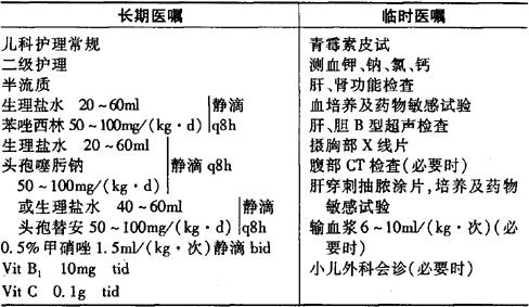 说明:1.小儿细菌性肝脓肿的病原菌主要为金黄色葡萄球菌、大肠埃希菌、链球菌,沙门菌或厌氧菌亦可见到,抗菌治疗根据肝穿刺脓液及血培养结果选用相应的抗生素。在明确病原前,可根据临床分析,针对可能的病原菌选用抗生素,疗程一般6~8周,交替应用。 2.本病是一严重消耗性疾病,故应加强全身性支持疗法,给予高蛋白、高热量、富含维生素的食物,必要时可给予静脉营养或输血浆、白蛋白等。 |