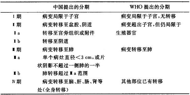 4.临床分期 我国至今仍采用协和医院(1962)制定的分期标准,WHO(1979)提出了新的分期方法。两种方法类同,故并列于表1.6.2。 表1.6.2 滋养细胞肿瘤的分期